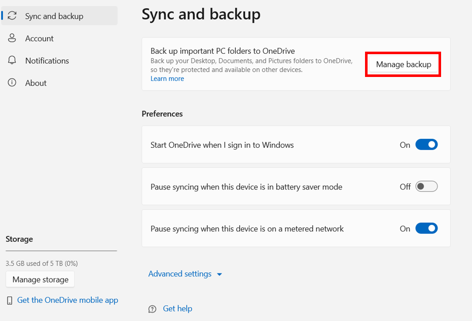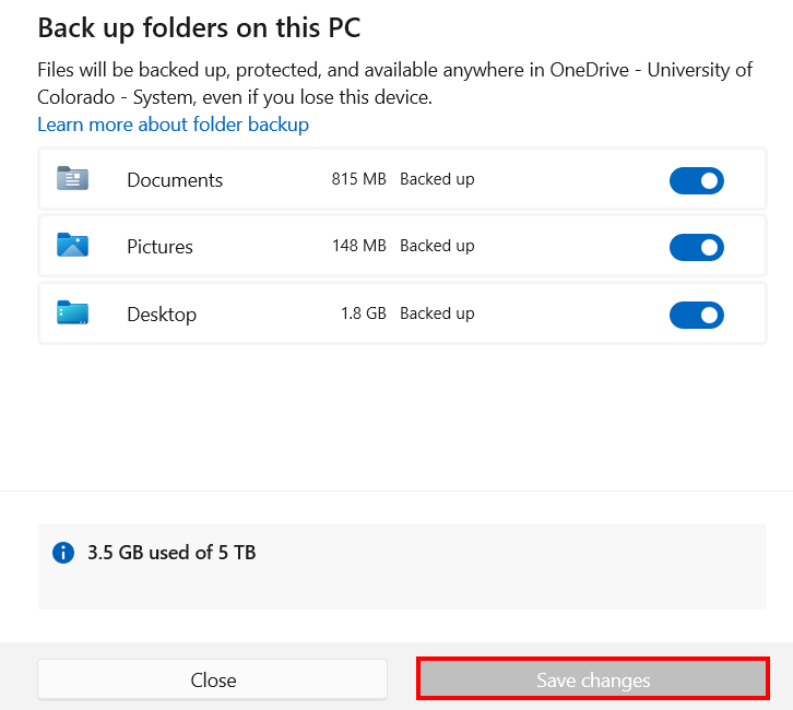 5. These folders are now backed up and will automatically sync to OneDrive when changes are made.