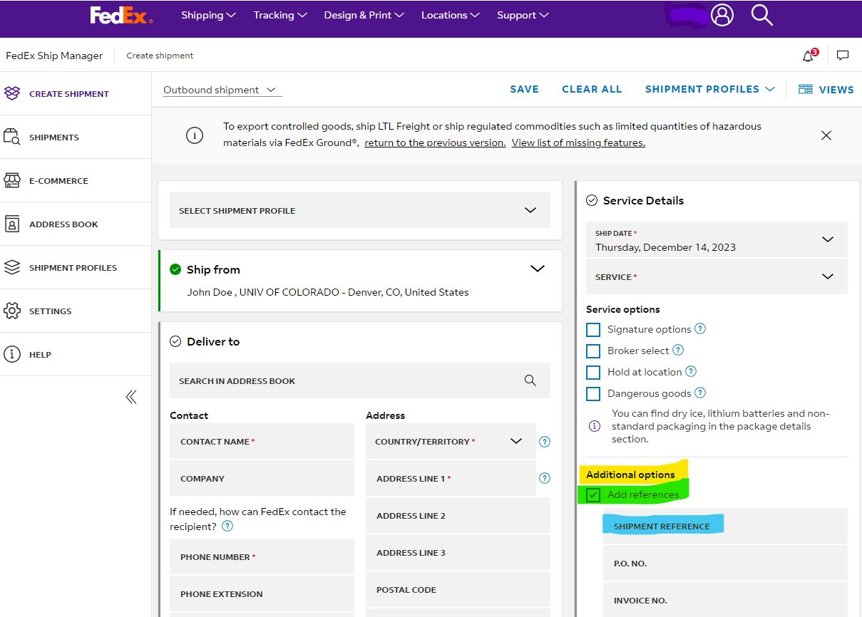 When logged in to your FedEx account and viewing the outbound shipping label, users can look for the "Additional Options" on the right side of the screen (highlighted in yellow). Below that section header, click the box next to “Add References” (highlighted in green). From there, you will see a field appear for a “Shipment Reference” (highlighted in blue) where you can enter your SpeedType for billing purposes.
