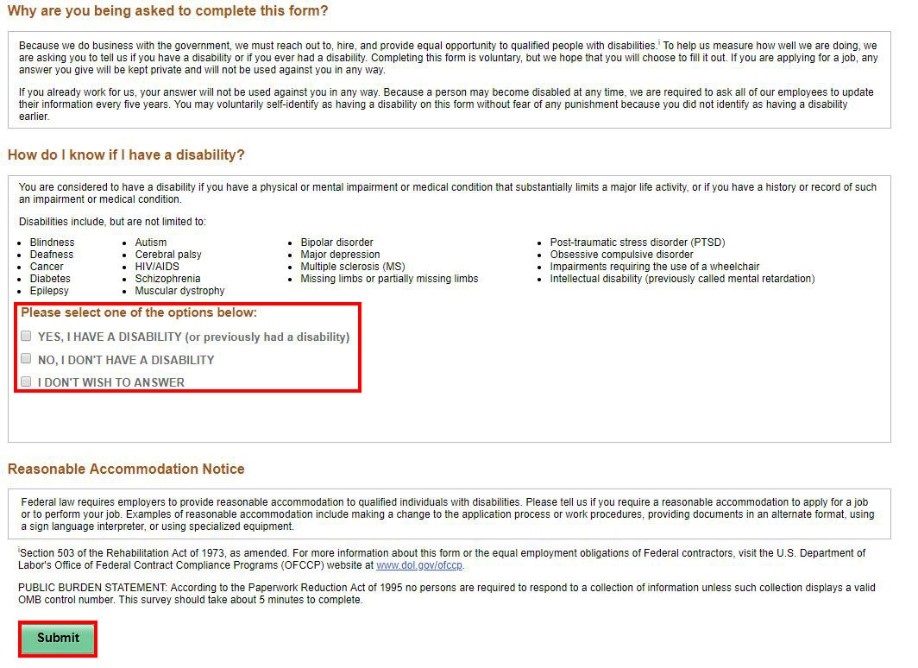 - Select the radio button that applies to you, then click Submit.